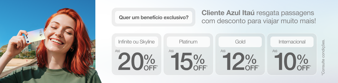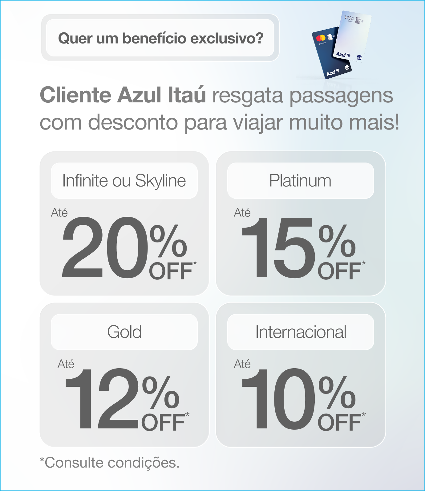 Regra Jurídica: Regulamento | Resgate Aéreo Cartão Azul Itaú Promoção válida apenas para clientes portadores do Cartão Azul Itaú. Para clientes com cartão Azul Itaú Infinite/Skyline ativo, descontos de até 20% para resgate de passagens na classe tarifária “W” e até 10% para as demais classes. Para clientes com cartão Azul Itaú Platinum ativo, descontos de até 15% para resgate de passagens na classe tarifária “W” e até 8% para as demais classes. Para clientes com cartão Azul Itaú Gold ativo, descontos de até 12% para resgate de passagens na classe tarifária “W” e até 6% para as demais classes. Para clientes com cartão Azul Itaú Internacional ativo, descontos de até 10% para resgate de passagens na classe tarifária "W" e até 5% de desconto nas demais classes. Desconto válido para 1 (uma) única compra de passagens em pontos nos voos domésticos vendidos e operados pela Azul Linhas Aéreas para embarques no período de 10/04/2026 a 24/06/2026, exceto 03/05/2026 e 03/06/2026 a 08/06/2026. Reservas são obrigatórias, as quais devem ser efetuadas a partir das 09:00 do dia 10/04/2026 até às 23:59 do dia 12/04/2026. Para obter os descontos apresentados, o titular da conta deverá ser um dos passageiros e não poderá haver alteração da quantidade de viajantes da reserva (PNR) após o resgate da passagem aérea. Se o titular da conta não for um dos passageiros da reserva (PNR), os descontos serão removidos. O valor apresentado está sujeito às regras tarifárias e disponibilidade de assentos. Em caso de cancelamento ou alteração do voo originalmente contratado, o desconto não ficará disponível para uma nova utilização e poderão ser aplicadas as penalidades descritas no regulamento. Promoção não cumulativa com outros descontos e condições diferenciadas de preço. A Azul se reserva o direito de modificar, suspender ou cancelar a promoção a qualquer tempo, sem aviso prévio. Não estão incluídos os impostos, taxas de emissão e taxas aeroportuárias (taxa de embarque), bem como os gastos habitualmente opcionais, como os serviços extras para passageiros, seguros, hospedagem e despesas pessoais. Para informações sobre franquia de bagagem consulte o site www.voeazul.com.br. Os clientes em desacordo com as normas estabelecidas pelo regulamento do Programa de Fidelidade da Azul, não estão elegíveis à esta promoção. Para informações sobre o programa Azul Fidelidade consulte o regulamento pelo site https://www.voeazul.com.br/br/pt/programa-fidelidade/regulamento.