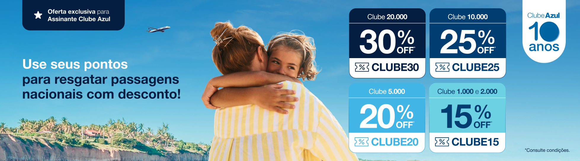 Promoção exclusiva para clientes com Clube Azul ativo. Para assinantes do Clube 20.000, desconto de 30% aplicando o código promocional CLUBE30. Para assinantes do Clube 10.000, desconto de 25% aplicando o código promocional CLUBE25. Para assinantes do Clube 5.000, desconto de 20% aplicando o código promocional CLUBE20. Para assinantes do Clube 1.000 ou 2.000, desconto de 15% aplicando o código promocional CLUBE15. Reservas são obrigatórias, as quais devem ser efetuadas a partir das 09:00 do dia 30/01/2026 às 23:59 do dia 01/02/2026. O titular da conta pagante da reserva obrigatoriamente deve ser um dos passageiros da reserva (PNR) e não poderá haver alteração da quantidade de viajantes da reserva (PNR) após o resgate da passagem aérea. Se o titular da conta não for um dos passageiros da reserva (PNR), os descontos serão removidos. O desconto será fornecido em forma de Promocode e deve ser inserido no campo “Código Promocional” durante a pesquisa da tarifa em pontos pelo site www.voeazul.com.br ou pelo aplicativo da Azul; válido para 1 (uma) única compra por cliente Azul Fidelidade elegível, nos voos domésticos vendidos e operados pela Azul Linhas Aéreas no período 04/02/2026 a 24/06/2026, exceto de 10/02/2026 a 14/02/2026, exceto de 17/02/2026 a 18/02/2026, 21/02/2026 a 23/02/2026, 01/04/2026 a 06/04/2026, 17/04/2026 a 18/04/2026, 21/04/2026 a 22/04/2026, 30/04/2026 a 04/05/2026 e 03/06/2026 a 08/06/2026. O valor apresentado está sujeito às regras tarifárias e disponibilidade de assentos. Em caso de cancelamento ou alteração do voo originalmente contratado, o promocode não ficará disponível para uma nova utilização e poderão ser aplicadas as penalidades descritas nos termos e condições de prestação de serviços disponibilizado em https://www.voeazul.com.br/br/pt/sobreazul/contrato-aereo. O bilhete emitido e valores apresentados estarão sujeitos ao contrato de voo aéreo, às regras tarifárias e disponibilidade de assentos. A Azul se reserva o direito de modificar, suspender ou cancelar a promoção a qualquer tempo, sem aviso prévio. Não estão incluídos os impostos, taxas de emissão e taxas aeroportuárias (taxa de embarque), bem como os gastos habitualmente opcionais, como os serviços extras para passageiros, seguros, hospedagem e despesas pessoais. Para informações sobre franquia de bagagem consulte o site www.voeazul.com.br. Os clientes em desacordo com as normas estabelecidas pelo regulamento do Programa de Fidelidade da Azul, não estão elegíveis à esta promoção. Para informações sobre o programa Azul Fidelidade consulte o regulamento pelo site https://www.voeazul.com.br/br/pt/programa-fidelidade.