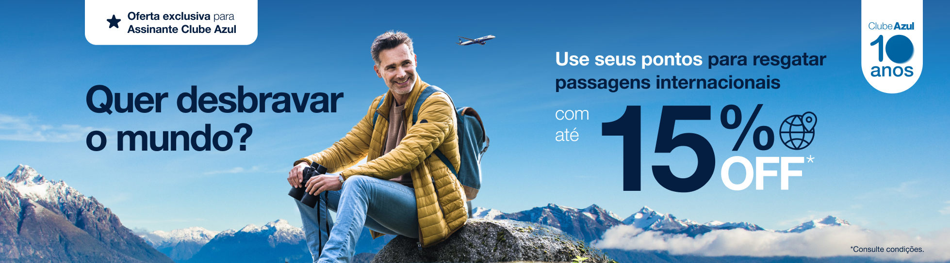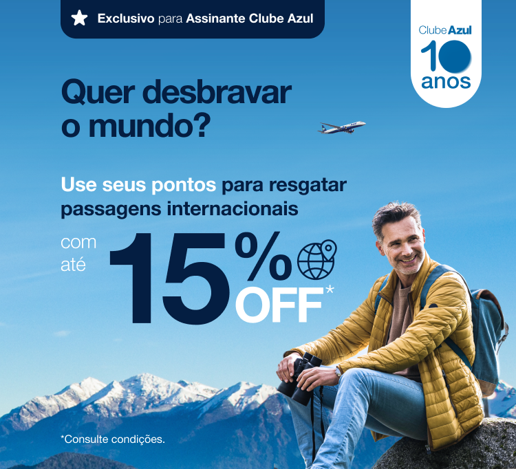 Promoção exclusiva para assinantes ativos do Clube Azul Descontos de até 15% para resgate de passagens na classe tarifária “W” e até 8% para as demais classes em voos internacionais operados exclusivamente pela Azul. Desconto válido para 1 (uma) única compra de passagens em pontos nos voos internacionais vendidos e operados exclusivamente pela Azul Linhas Aéreas para embarques no período 04/02/2026 a 24/06/2026, exceto de 10/02/2026 a 14/02/2026, 17/02/2026 a 18/02/2026, 21/02/2026 a 23/02/2026, 01/04/2026 a 06/04/2026, 17/04/2026 a 18/04/2026, 21/04/2026 a 22/04/2026, 30/04/2026 a 04/05/2026 e 03/06/2026 a 08/06/2026. Reservas são obrigatórias, as quais devem ser efetuadas a partir das 09:00 do dia 30/01/2025 às 23:59 do dia 01/02/2025. Para obter o desconto, o titular da conta pagante deve ser obrigatoriamente um dos passageiros da reserva (PNR) e não poderá haver alteração da quantidade de viajantes da reserva (PNR) após o resgate da passagem aérea. Se o titular da conta não for um dos passageiros da reserva (PNR), os descontos serão removidos. O valor apresentado está sujeito às regras tarifárias e disponibilidade de assentos. Em caso de cancelamento ou alteração do voo originalmente contratado, o desconto não ficará disponível para uma nova utilização e poderão ser aplicadas as penalidades descritas nos termos e condições de prestação de serviços disponibilizado em https://www.voeazul.com.br/br/pt/sobreazul/contrato-aereo. Promoção não cumulativa com outros descontos e condições diferenciadas de preço. A Azul se reserva o direito de modificar, suspender ou cancelar a promoção a qualquer tempo, sem aviso prévio. Não estão incluídos os impostos, taxas de emissão e taxas aeroportuárias (taxa de embarque), bem como os gastos habitualmente opcionais, como os serviços extras para passageiros, seguros, hospedagem e despesas pessoais. Para informações sobre franquia de bagagem consulte o site www.voeazul.com.br. Os clientes em desacordo com as normas estabelecidas pelo regulamento do Programa de Fidelidade da Azul, não estão elegíveis à esta promoção. Para informações sobre o programa Azul Fidelidade consulte o regulamento pelo site https://www.voeazul.com.br/br/pt/programa-fidelidade.