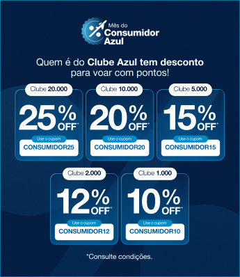 Promoção exclusiva para clientes com Clube Azul ativo. Para assinantes do Clube 20.000, desconto de 25% aplicando o código promocional CONSUMIDOR25. Para assinantes do Clube 10.000, desconto de 20% aplicando o código promocional CONSUMIDOR20. Para assinantes do Clube 5.000, desconto de 15% aplicando o código promocional CONSUMIDOR15. Para assinantes do Clube 2.000, desconto de 12% aplicando o código promocional CONSUMIDOR12. Para assinantes do Clube 1.000, desconto de 10% aplicando o código promocional CONSUMIDOR10. Reservas são obrigatórias, as quais devem ser efetuadas a partir das 09:00 do dia 13/03/2026 às 23:59 do dia 15/03/2026. O desconto será fornecido em forma de Promocode e deve ser inserido no campo “Código Promocional” durante a pesquisa da tarifa em pontos pelo site www.voeazul.com.br ou pelo aplicativo da Azul; válido para 1 (uma) única compra por cliente Azul Fidelidade elegível, nos voos domésticos vendidos e operados pela Azul Linhas Aéreas no período 20/03/2026 a 24/06/2026, exceto 04/05/2026 e de 03/06/2026 a 08/06/2026. O valor apresentado está sujeito às regras tarifárias e disponibilidade de assentos. Em caso de cancelamento ou alteração do voo originalmente contratado, o promocode não ficará disponível para uma nova utilização e poderão ser aplicadas as penalidades descritas nos termos e condições de prestação de serviços disponibilizado em https://www.voeazul.com.br/br/pt/sobreazul/contrato-aereo. O titular da conta pagante da reserva obrigatoriamente deve ser um dos passageiros da reserva (PNR) e não poderá haver alteração da quantidade de viajantes da reserva (PNR) após o resgate da passagem aérea. Se o titular da conta não for um dos passageiros da reserva (PNR), os descontos serão removidos. O bilhete emitido e valores apresentados estarão sujeitos ao contrato de voo aéreo, às regras tarifárias e disponibilidade de assentos. A Azul se reserva o direito de modificar, suspender ou cancelar a promoção a qualquer tempo, sem aviso prévio. Não estão incluídos os impostos, taxas de emissão e taxas aeroportuárias (taxa de embarque), bem como os gastos habitualmente opcionais, como os serviços extras para passageiros, seguros, hospedagem e despesas pessoais. Para informações sobre franquia de bagagem consulte o site www.voeazul.com.br. Os clientes em desacordo com as normas estabelecidas pelo regulamento do Programa de Fidelidade da Azul, não estão elegíveis à esta promoção. Para informações sobre o programa Azul Fidelidade consulte o regulamento pelo site https://www.voeazul.com.br/br/pt/programa-fidelidade.