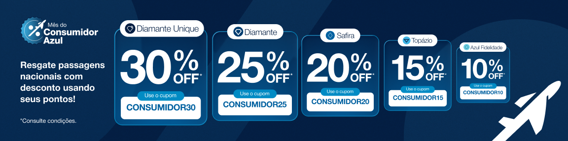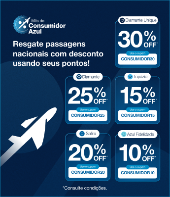 Regulamento Resgate Aéreo | Código promocional Nacional Promoção exclusiva para clientes com cadastro ativo no programa de fidelidade da Azul. Para clientes do nível Azul Diamante Unique, desconto de 30% aplicando o código promocional CONSUMIDOR30 Para clientes do nível Azul Diamante, desconto de 25% aplicando o código promocional CONSUMIDOR25 Para clientes do nível Azul Safira, desconto de 20% aplicando o código promocional CONSUMIDOR20 Para clientes do nível Azul Topázio, desconto de 15% aplicando o código promocional CONSUMIDOR15 Para clientes do nível Azul Fidelidade, desconto de 10% aplicando o código promocional CONSUMIDOR10. Reservas são obrigatórias, as quais devem ser efetuadas a partir das 09:00 do dia 16/03/2026 às 23:59 do dia 22/03/2026. O titular da conta pagante da reserva obrigatoriamente deve ser um dos passageiros da reserva (PNR) e não poderá haver alteração da quantidade de viajantes da reserva (PNR) após o resgate da passagem aérea. Se o titular da conta não for um dos passageiros da reserva (PNR), os descontos serão removidos. O desconto será fornecido em forma de Promocode e deve ser inserido no campo “Código Promocional” durante a pesquisa da tarifa em pontos pelo site www.voeazul.com.br ou pelo aplicativo da Azul; válido para 1 (uma) única compra por cliente Azul Fidelidade elegível, nos voos domésticos vendidos e operados pela Azul Linhas Aéreas no período de 25/03/2026 a 24/06/2026, exceto de 03/05/202, 03/06/2026 a 04/06/2026 e 07/06/2026 a 08/06/2026. Em caso de cancelamento ou alteração do voo originalmente contratado por opção do cliente, o promocode não ficará disponível para um novo resgate. O bilhete emitido e valores apresentados estarão sujeitos ao contrato de voo aéreo, às regras tarifárias e disponibilidade de assentos. A Azul se reserva o direito de modificar, suspender ou cancelar a promoção a qualquer tempo, sem aviso prévio. Não estão incluídos os impostos, taxas de emissão e taxas aeroportuárias (taxa de embarque), bem como os gastos habitualmente opcionais, como os serviços extras para passageiros, seguros, hospedagem e despesas pessoais. Para informações sobre franquia de bagagem consulte o site www.voeazul.com.br. Os clientes em desacordo com as normas estabelecidas pelo regulamento do Programa de Fidelidade da Azul, não estão elegíveis à esta promoção. Para informações sobre o programa Azul Fidelidade consulte o regulamento pelo site https://www.voeazul.com.br/br/pt/programa-fidelidade. Para fins de campanhas promocionais da Azul e Azul Fidelidade, o cliente do Grupo AZUL ONE está equiparado ao nível mais alto do Programa Azul Fidelidade, ou seja, ao nível Diamante Unique, estando sujeito às condições e regras do referido nível. Resgate Aéreo | Desconto em Mercados Internacionais Promoção exclusiva para clientes com cadastro ativo no programa de fidelidade da Azul. Descontos de até 20% para resgate de passagens na classe tarifária “W” e até 10% para as demais classes em voos internacionais operados exclusivamente pela Azul Linhas Aéreas. Desconto válido para 1 (uma) única compra de passagens em pontos nos voos internacionais vendidos e operados exclusivamente pela Azul Linhas Aéreas para embarques no período de 25/03/2026 a 24/06/2026, exceto de 03/05/2026 e 03/06/2026 a 04/06/2026 e 07/06/2026 a 08/06/2026. Reservas são obrigatórias, as quais devem ser efetuadas a partir das 09:00 do dia 16/03/2026 às 23:59 do dia 22/03/2026. Para obter o desconto, o titular da conta pagante deve ser obrigatoriamente um dos passageiros da reserva (PNR) e não poderá haver alteração da quantidade de viajantes da reserva (PNR) após o resgate da passagem aérea. Se o titular da conta não for um dos passageiros da reserva (PNR), os descontos serão removidos. O valor apresentado está sujeito às regras tarifárias e disponibilidade de assentos. Em caso de cancelamento ou alteração do voo originalmente contratado, o desconto não ficará disponível para uma nova utilização e poderão ser aplicadas as penalidades descritas nos termos e condições de prestação de serviços disponibilizado em https://www.voeazul.com.br/br/pt/sobreazul/contrato-aereo Promoção não cumulativa com outros descontos e condições diferenciadas de preço. A Azul se reserva o direito de modificar, suspender ou cancelar a promoção a qualquer tempo, sem aviso prévio. Não estão incluídos os impostos, taxas de emissão e taxas aeroportuárias (taxa de embarque), bem como os gastos habitualmente opcionais, como os serviços extras para passageiros, seguros, hospedagem e despesas pessoais. Para informações sobre franquia de bagagem consulte o site www.voeazul.com.br. Os clientes em desacordo com as normas estabelecidas pelo regulamento do Programa de Fidelidade da Azul, não estão elegíveis à esta promoção. Para informações sobre o programa Azul Fidelidade consulte o regulamento pelo site https://www.voeazul.com.br/br/pt/programa-fidelidade.